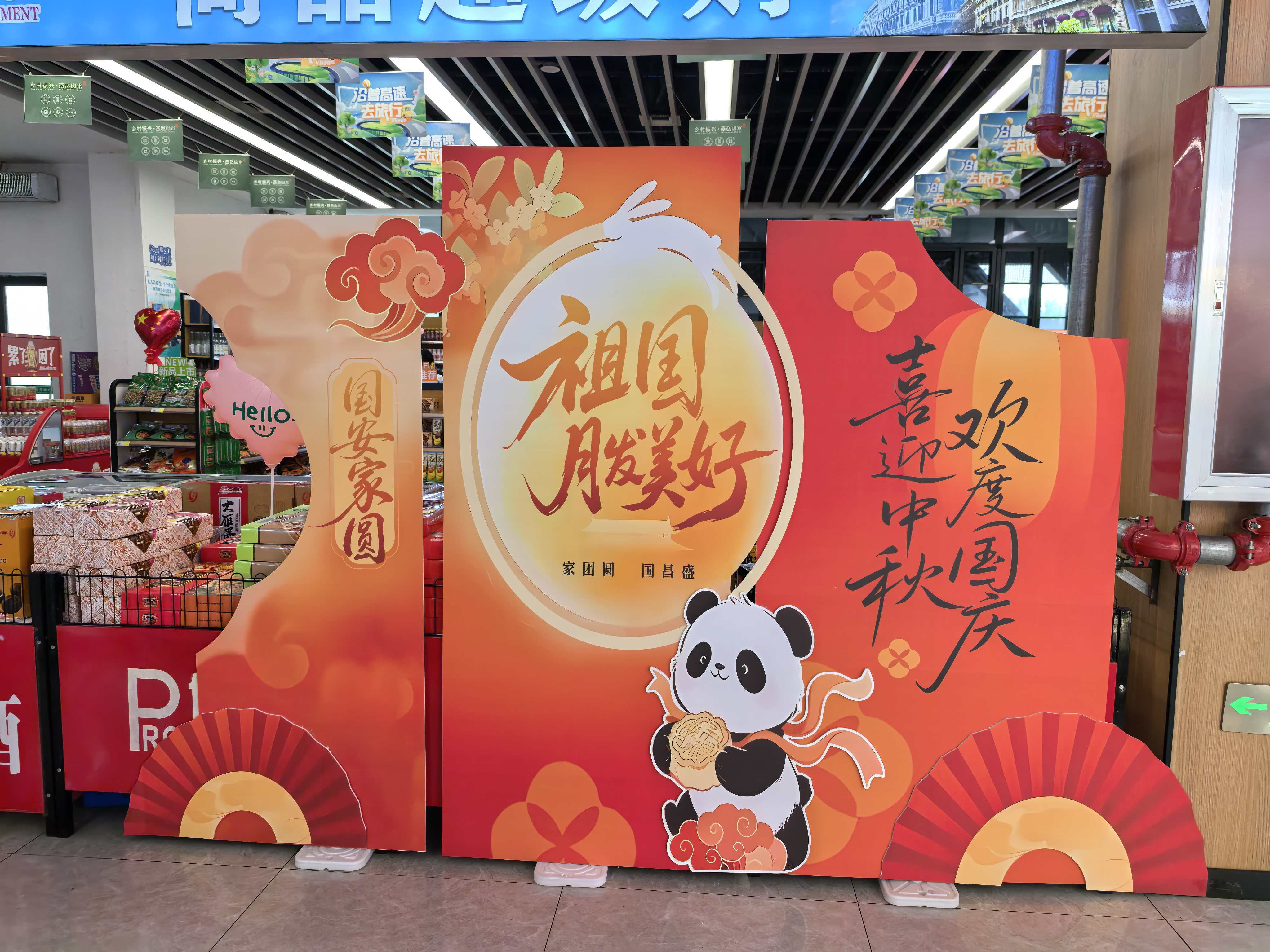 为了让顾客更好地感受双节浓厚的出行氛围,商贸分公司在多个商超卖场设置节日美陈,打造双节主题打卡点。石家庄东服务区的中秋的月饼展示区,将藁城的网红黄庄月饼进行展销;山海关服务区的国庆主题美陈,让人们身临其境为祖国母亲庆生。