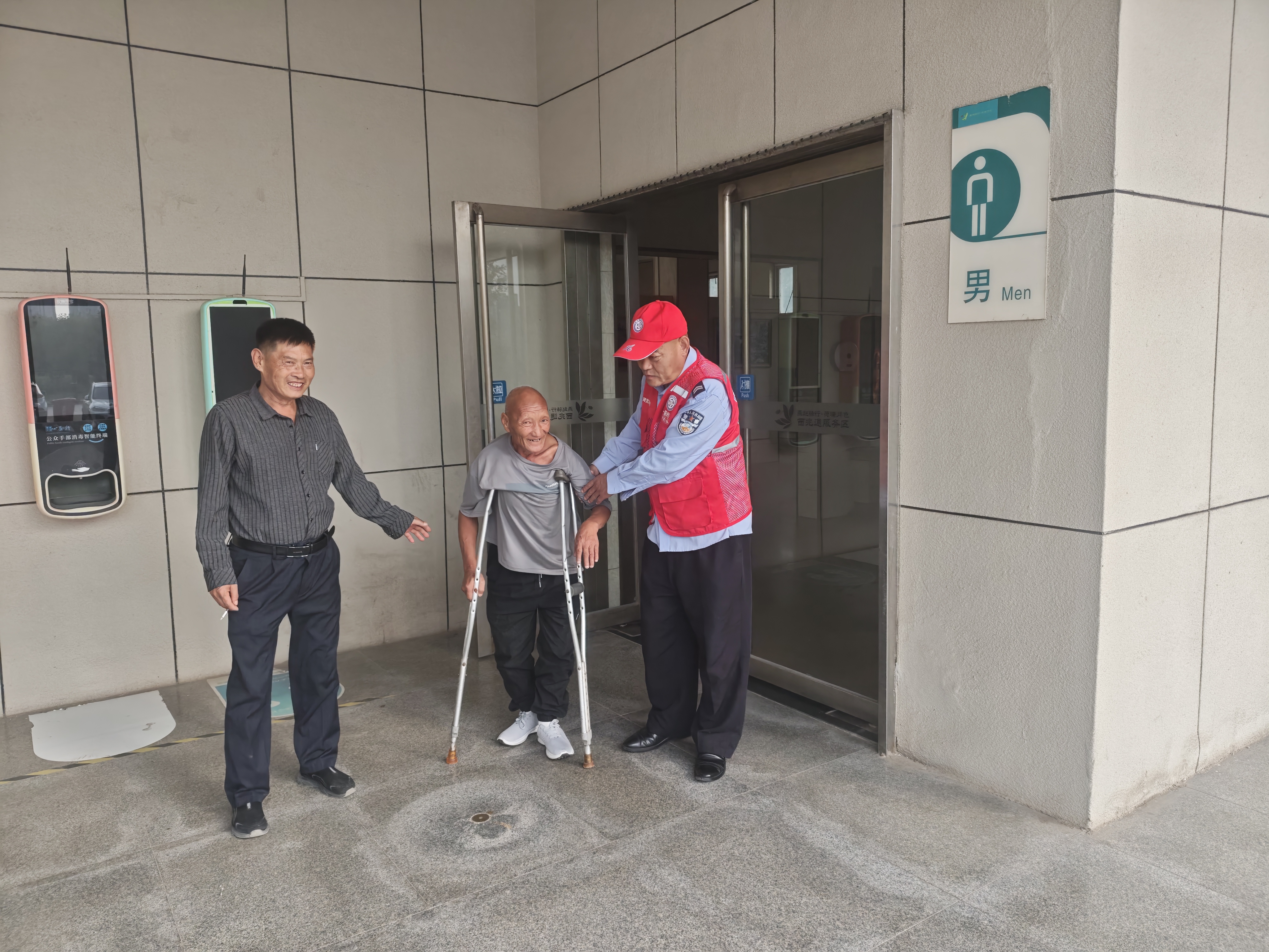 一位拄着拐杖的老人在服务区内缓缓挪动,脚步蹒跚地朝着卫生间方向走去,略显吃力的模样被志愿服务人员郭队长看在眼里。他立刻快步上前,轻声询问老人需求:“大爷,您行动不方便,我扶您过去吧?”得到老人点头应允后,郭队小心翼翼地扶住老人的胳膊,放慢脚步,配合着老人的节奏稳步前行,途中还不时提醒:“大爷,这边地面有点滑,您慢着点走。”