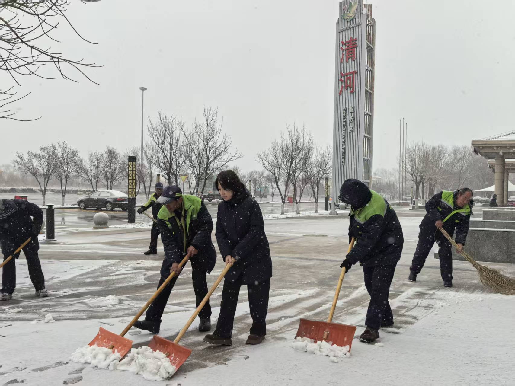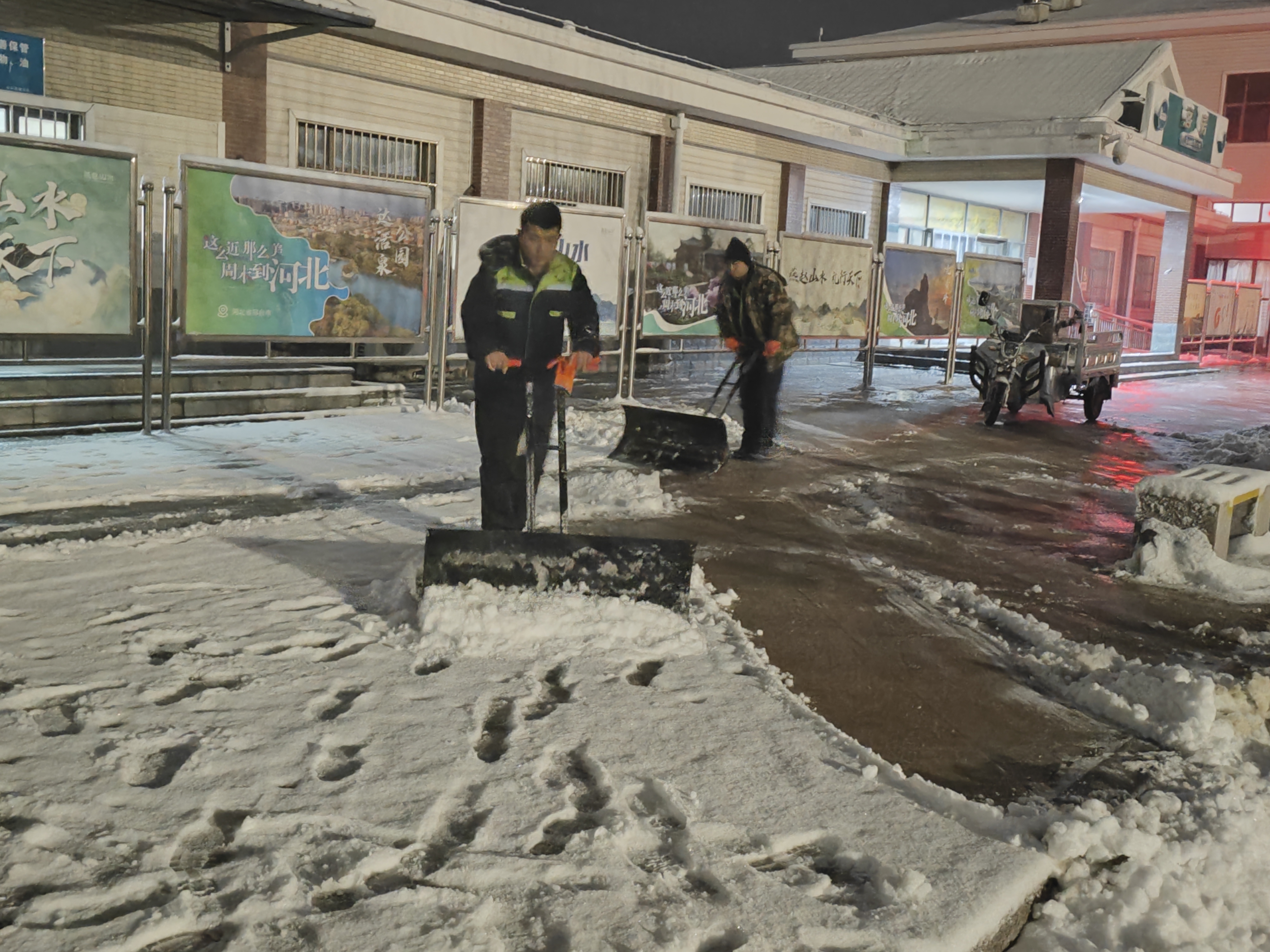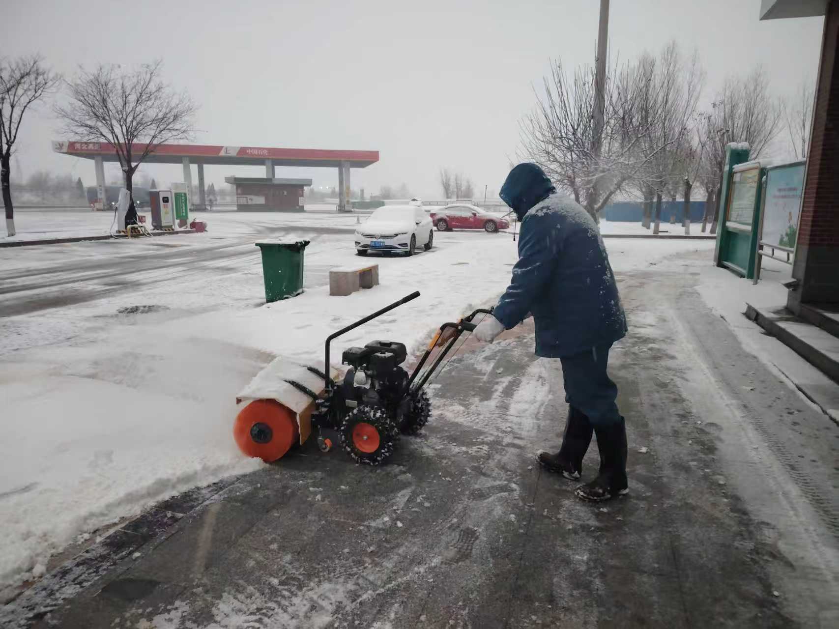 雪落即动,全员上阵。各部门在岗人员齐上阵,携带除雪工具,顶风冒雪开展清扫作业。大家分工协作,优先对小广场、经营区域门前、办公楼周边等人员活动密集场所进行积雪清理,确保顾客与员工行走安全。同时,为确保车辆通行顺畅,随后对服务区大广场进行加快清扫,避免积雪压实结冰。