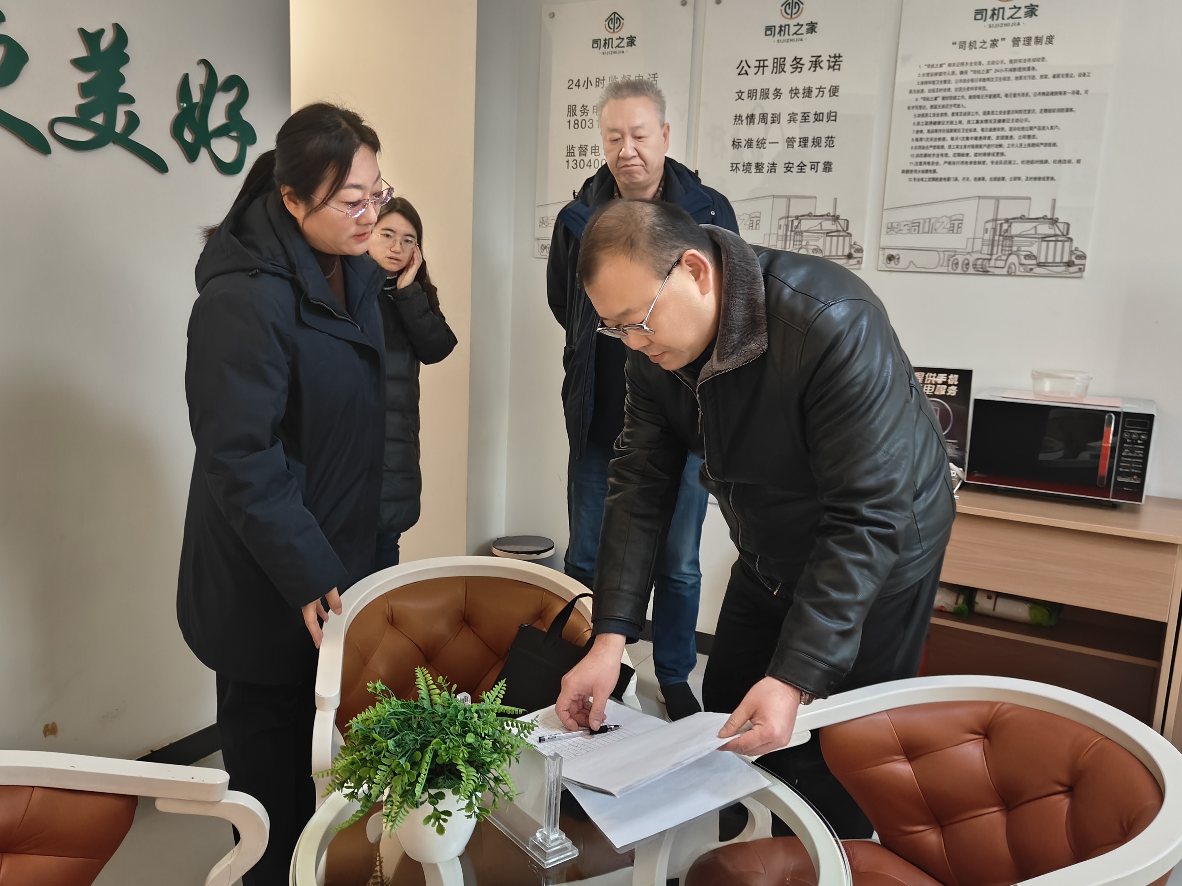 12月17日,省交通运输厅综合运输处干部、省道路运输协会秘书长王宁一行,到燕赵驿行集团滦州服务区开展“司机之家”建设验收工作。燕赵驿行集团董事长助理刘洪江、工会副主席王哲及分公司总监陪同。
