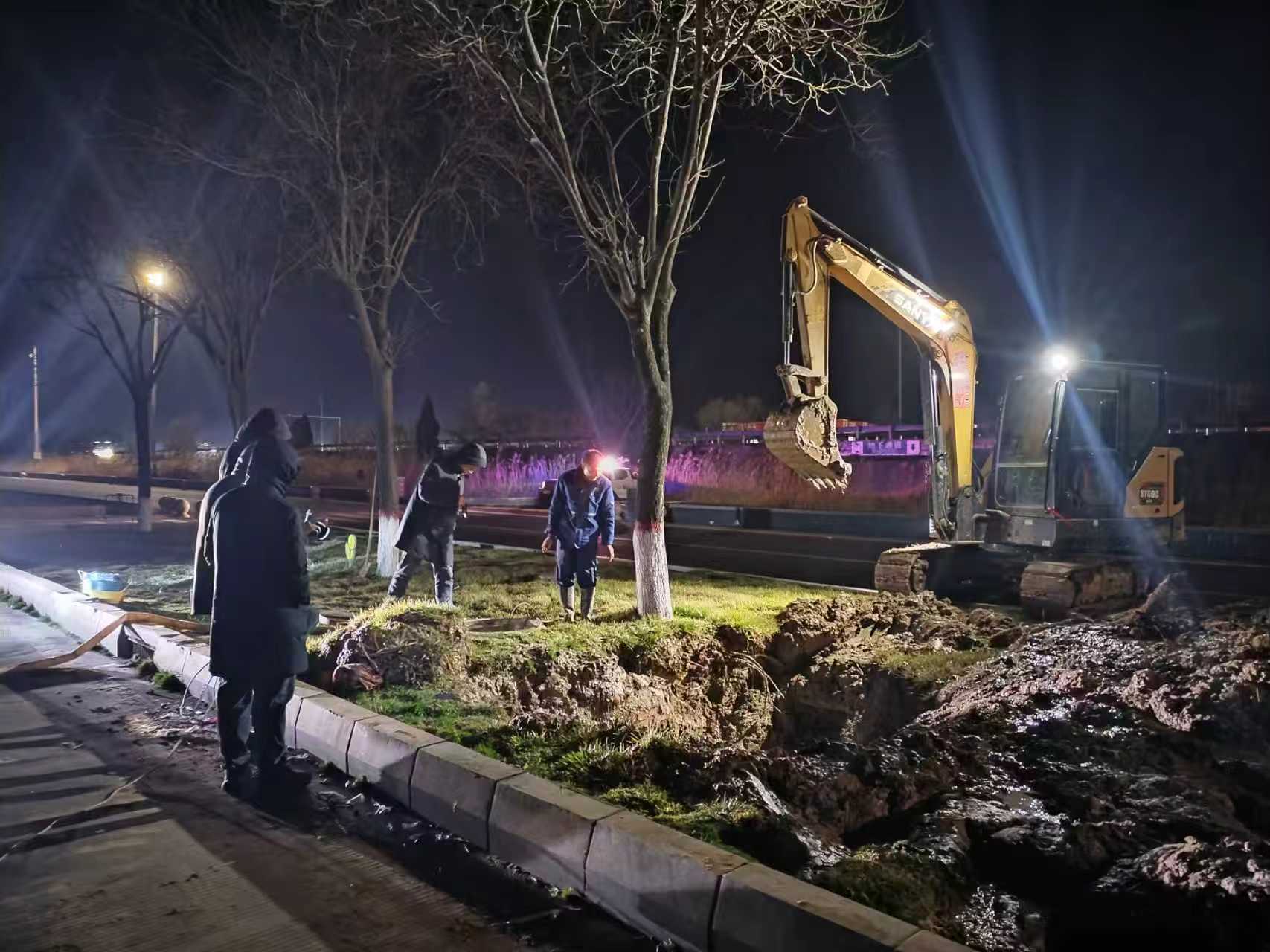 后勤维修人员主动请缨,结合自身多年管道维修经验,反复勘察破损管道情况,细致研判维修难点,制定了简易高效的维修方案,避免不必要的物料浪费。值班领导同步部署,一边联系挖机连夜进场施工,一边安排人员紧急采买维修配件,不料挖机开挖后发现,实际管道破损程度超出预期,给自主维修带来更大挑战。