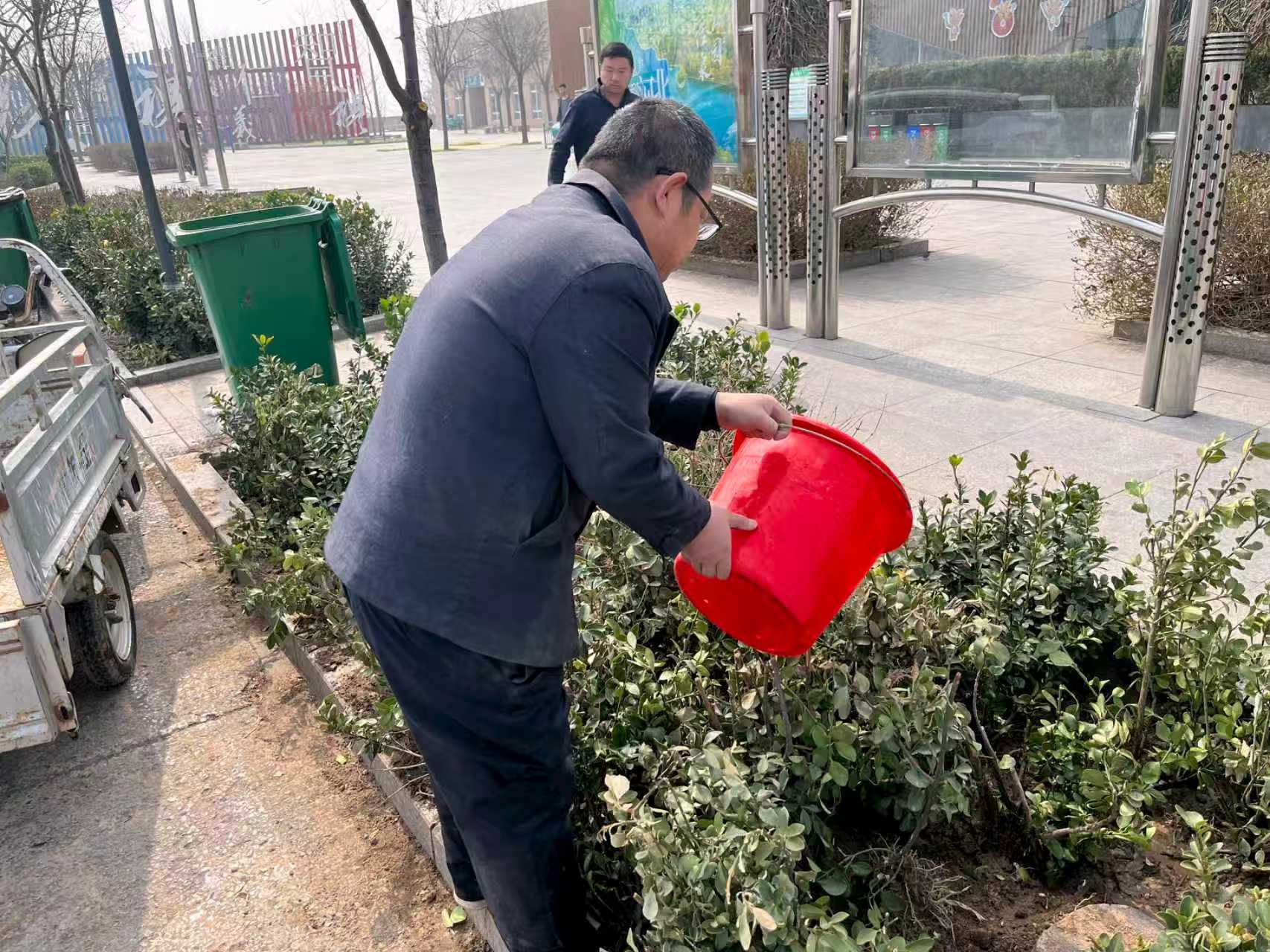 活动现场,大家分工协作、干劲十足。挥锹铲土、扶苗培土、提水浇灌,每一个环节都细致认真。铁锹起落间,新栽的冬青苗稳稳扎根土壤;红色水桶倾洒的清水,为幼苗送去生长的滋养。从挖坑定植到覆土压实,从浇水养护到现场规整,大家齐心协力、默契配合,原本略显单调的绿化带逐渐被错落有致的冬青苗覆盖,为南宫服务区增添了一抹清新的新绿。